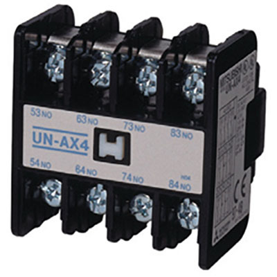 Bloco de contato auxiliar tipo clip-on da Mitsubishi Electric, projetado para montagem direta em contatores da série D-N. Este componente é essencial para a expansão das capacidades de sinalização e controle de circuitos.
