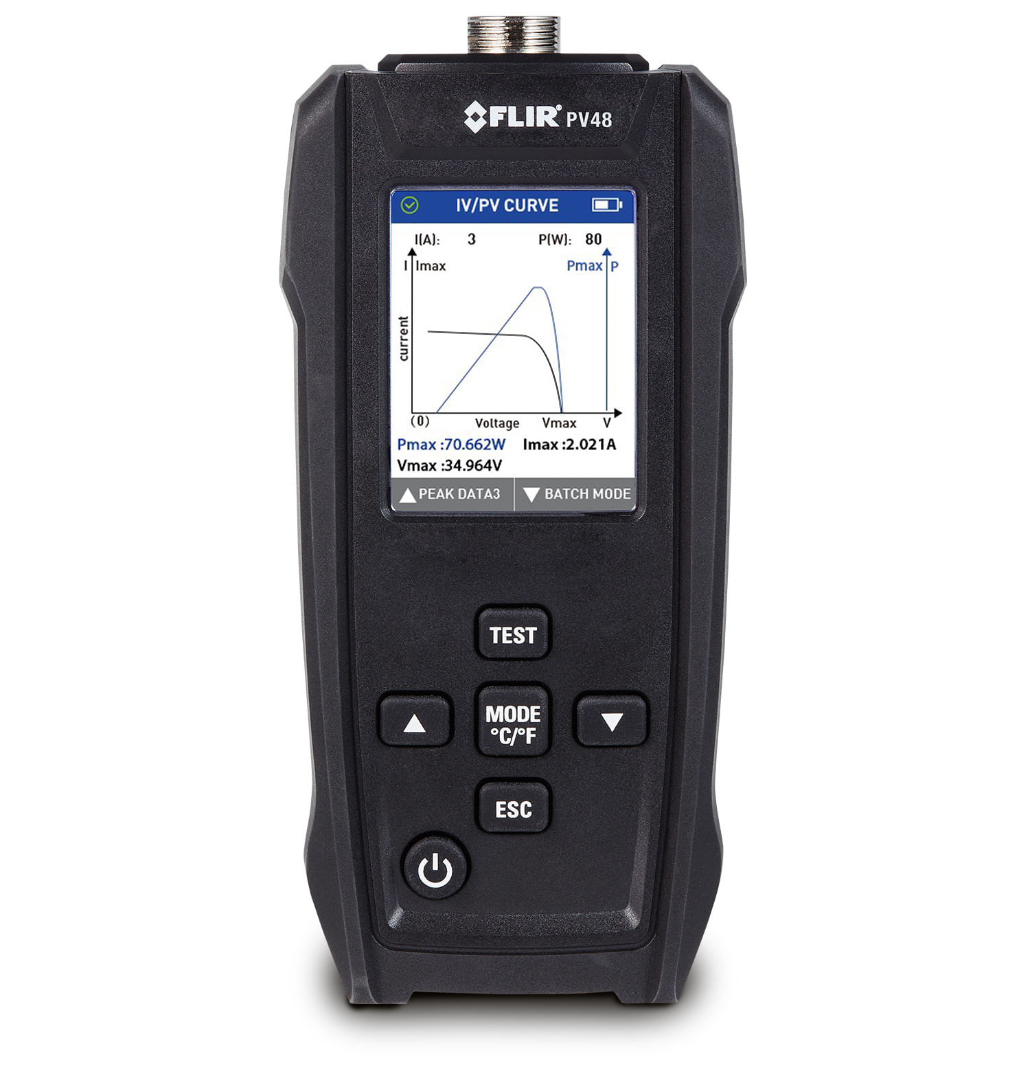 Teste o desempenho do painel com medições instantâneas de potência máxima, temperatura e traçador de curva I-V