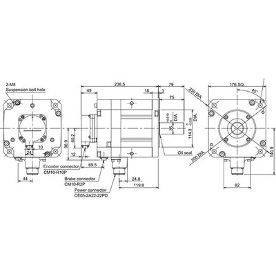 Com uma classe de tensão de alimentação de 200Vac, o motor atinge um torque nominal de 11,1 Nm, torque de estol de 22,5 Nm e uma velocidade rotacional nominal de 3000rpm. O design inclui montagem por flange de 176x176mm e proteção IP67, sendo adequado para temperaturas ambientes de 0 a 40°C.