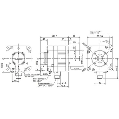 O motor opera em uma classe de tensão de 200Vac, com uma corrente nominal de 6.8A. Ele oferece um torque nominal de 6.4Nm e um torque de parada de 13.7Nm, com uma velocidade nominal de rotação de 3000rpm. O design inclui montagem em flange de 176x176mm, grau de proteção IP67 e é classificado para operação em temperaturas ambientes de 0 a 40°C.
