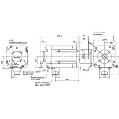 Projetado para operar em temperaturas ambientes de 0 a +40°C, o motor possui um flange de montagem de 176x176mm e um grau de proteção IP67, garantindo robustez e confiabilidade em ambientes industriais. A classificação de tensão de alimentação é de 200Vca.