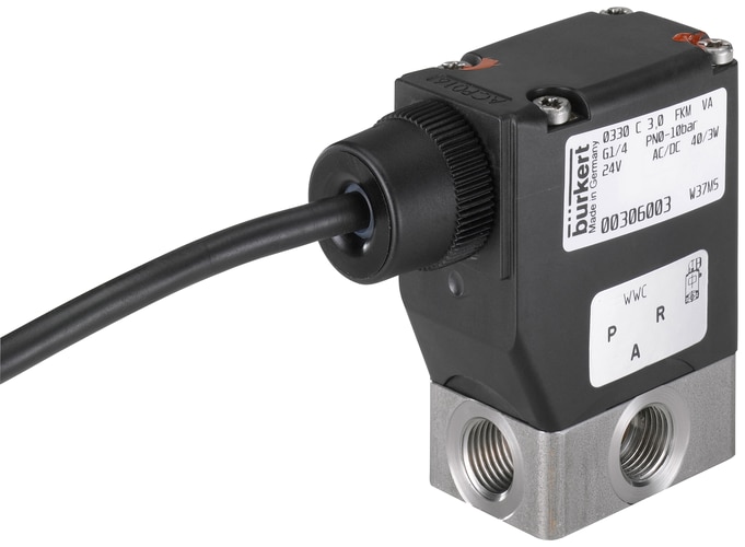 * Válvula de 3/2 vias. * Conexões G1/4. * Material: Aço Inoxidável. * Vedação em FKM (Fluorborracha). * Faixa de pressão: 0,00 bar a 4,00 bar. * Tensão de alimentação: 24 V. * Temperatura de operação: 0,00 °C a 60,00 °C.